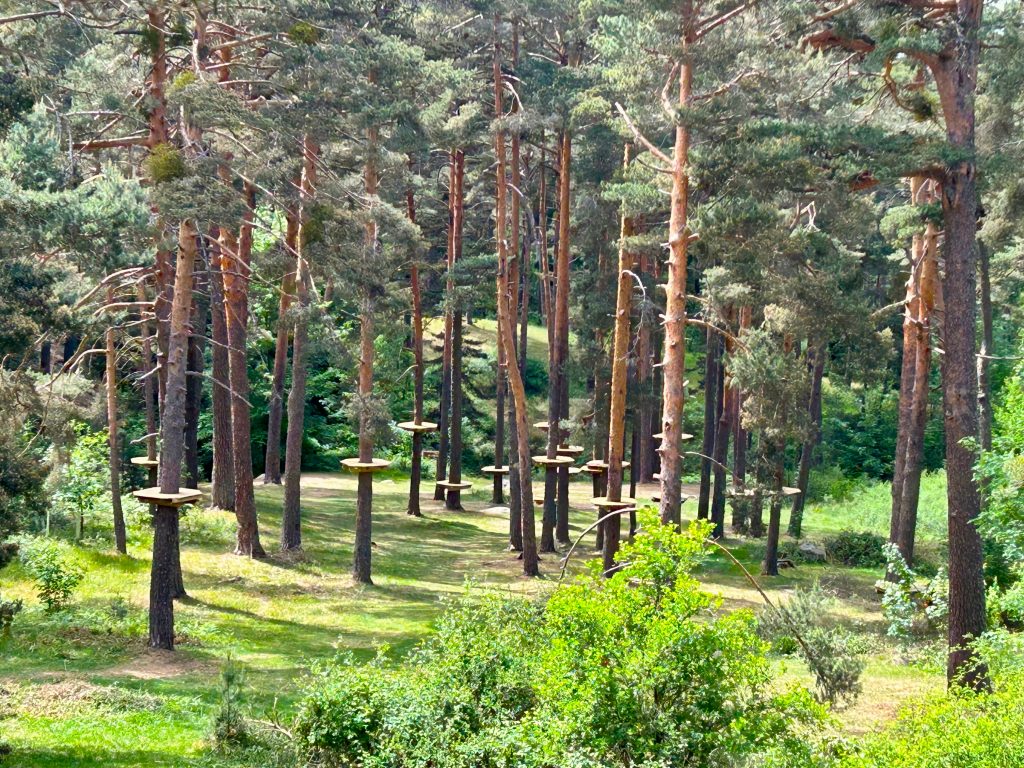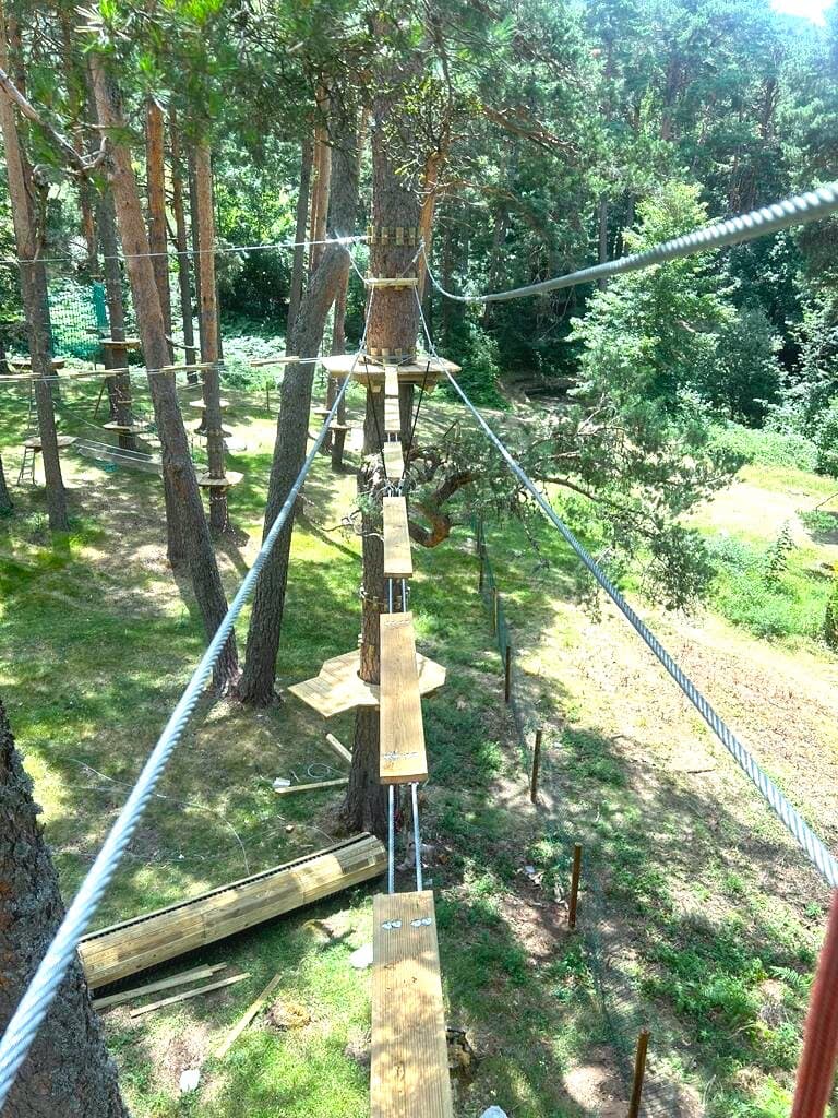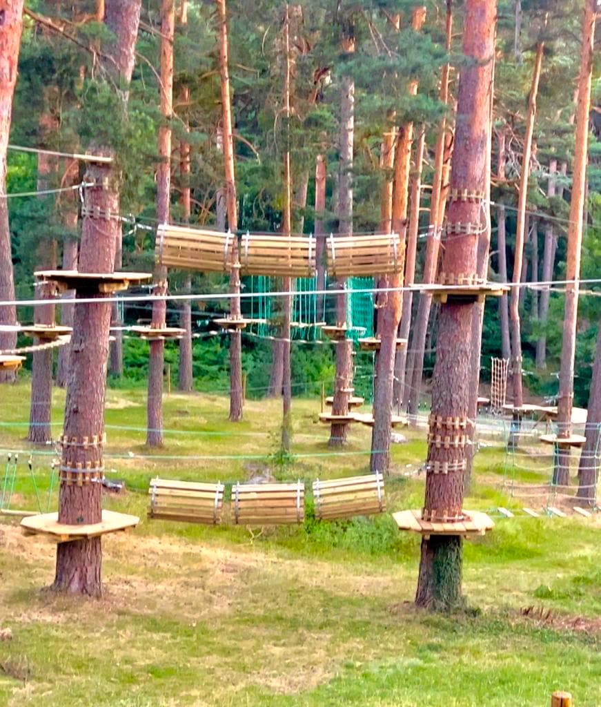circuitos combinados de grandes tirolinas con puentes, túneles colgantes, redes verticales y una variedad de juegos recreativos. Todo esto transcurre entre plataformas de madera fijadas a los árboles u otro tipo de soportes como pilonas, torres o rocas.